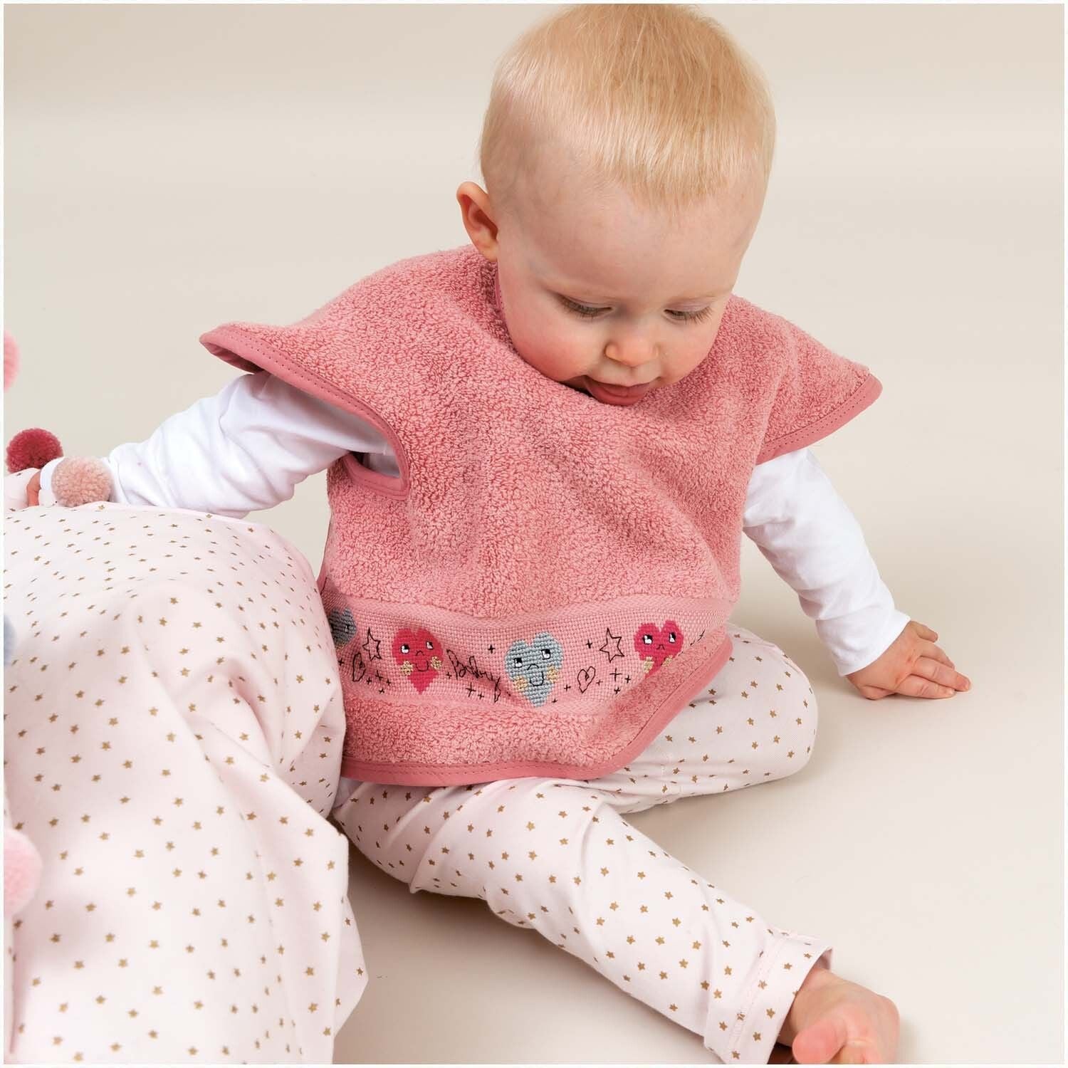 Dieses kuschelig-weiche Ärmellätzchen aus hochwertiger Frottierware verspricht Formbeständigkeit und Langlebigkeit. Am unteren Ende befindet sich eine eingewebte Aidabordüre zum Besticken. Hier können Sie Ihre Motive ganz nach Lust und Laune mit Bildern, Mustern oder Namen aufbringen.  |